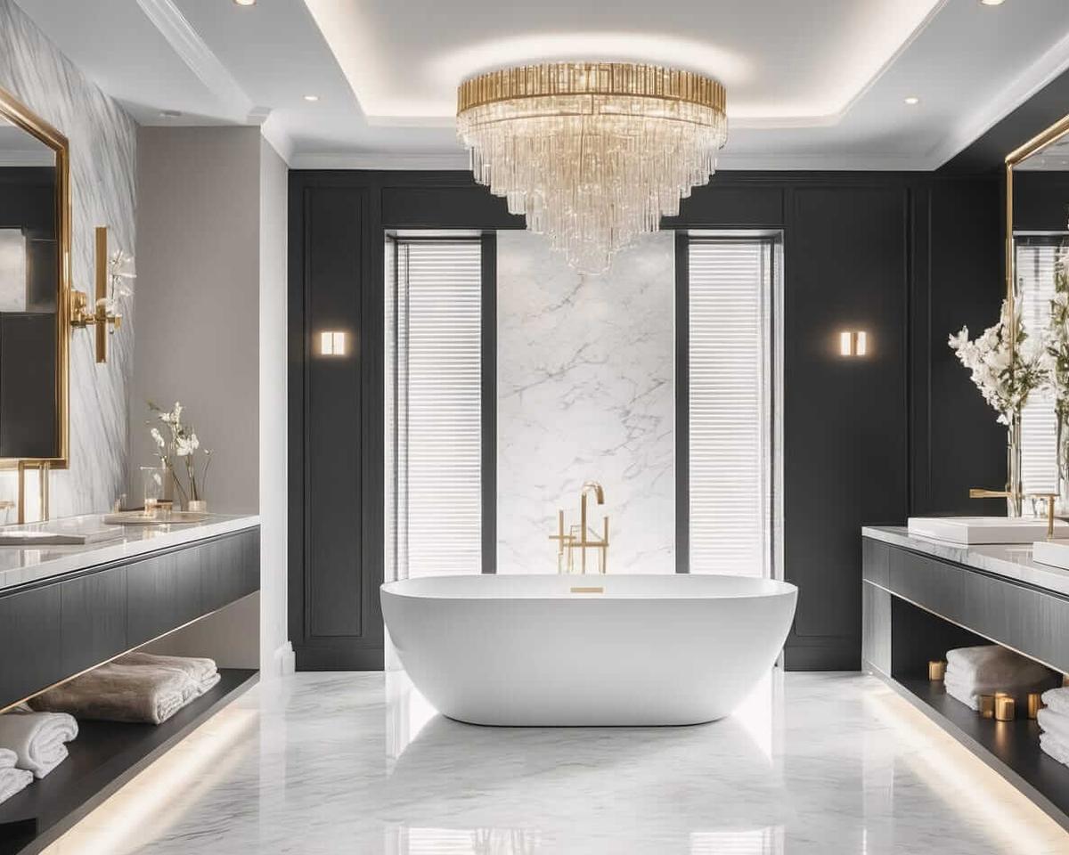 Styl glamour w czarno złotej łazience opiera się na połysku, wyrafinowanych detalach i grze światła. Pojawiają się tu płytki imitujące marmur, lustra w ozdobnych ramach, oświetlenie z dekoracyjnymi oprawami.